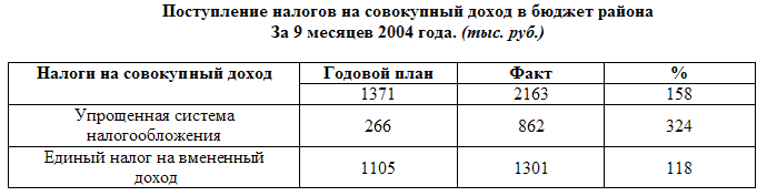 Поступление налогов на совокупный доход в бюджет района за 9 месяцев 2004 года. (тыс. руб.)