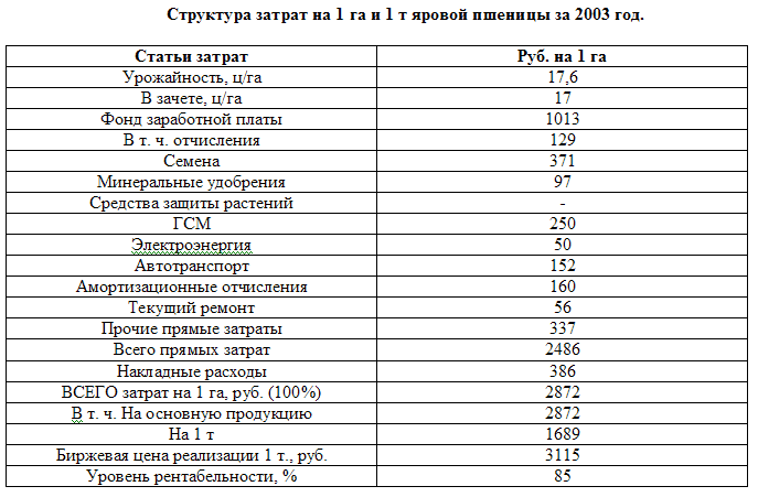 Не смогли мы преодолеть старые стереотипы мышления, иждивенческие настроения. Не создаем инвестиционную привлекательность, гарантии вложений частного капитала. А более того уже отпугнули частный бизнес. А проблема не только в бизнесменах, а прежде всего в нас. Мы пока не хотим вникать в интересы бизнеса, не хотим их слушать, а может и учиться, пытаемся сохранить большой районный колхоз. Хотя за примерами не надо ехать за границу и учиться у капиталиста. Есть свои. Фермер Маслаков Г. Д. на своих 100 гектарах выращивает яровую пшеницу 3 класса и имеет рентабельность 85%. Сравнительная структура затрат на 1 га и 1 т яровой пшеницы показывает, что себестоимость единицы продукции у фермера в 3 раза меньше, чем у лучших хозяйств района. Секрет в технологии возделывания культуры и чувство хозяина.
